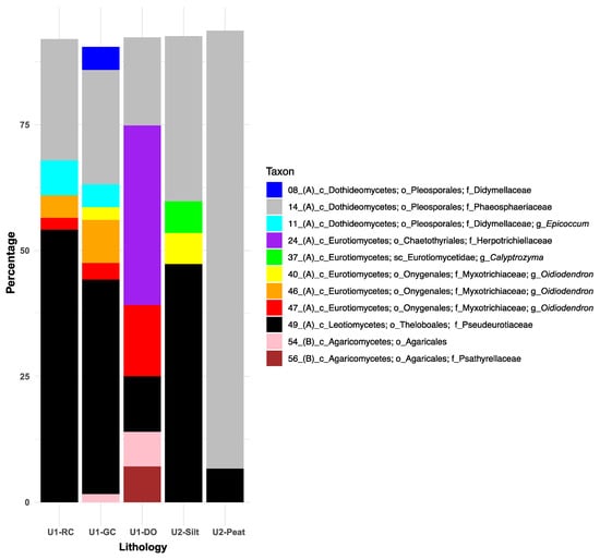 Using a 90% cut-off for SIMPER analyses, eleven fungal taxa were identified as exhibiting the greatest associations with one or more primary lithologies (Figure 4). Within the class Dothideomycetes and the order Pleosporales, Phaeosphaeriaceae (ASV14) contributed between 20% and 95% to within-group similarities across all lithologies, peaking in U2 peat intervals and reaching a low in U1b diatom ooze. In contrast, Didymellaceae-related ASVs 8 and 11 demonstrated only weak SIMPER associations (~8% combined) with the lacustrine clays.