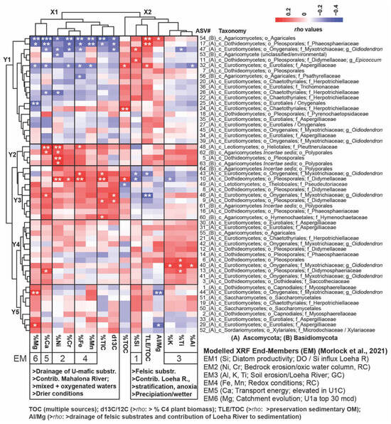 The heatmap in Figure 5 shows the Spearman rho values and significance levels between downcore changes in normalized and square-root-transformed read abundances of fungal ASVs and relative changes in available organic, inorganic, and isotopic geochemical parameters [40,44,55,56]. This reveals two distinct vertical clusters with geochemical parameters (X1 and X2) and five horizontal (Y1–Y5) subclusters with fungal taxa.