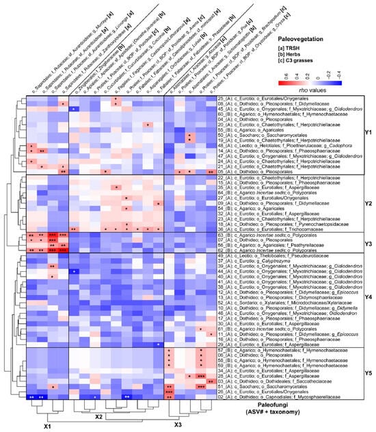 Figure 6 depicts a heatmap showing the Spearman Rank Correlations between individual paleovegetation and paleofungal community members using normalized and square-root-transformed trnL-P6 versus 18SV9 reads. This analysis identified three horizontal clusters (X1–X3) for paleovegetation members and five vertical clusters (Y1–Y5) for paleofungal taxa.
