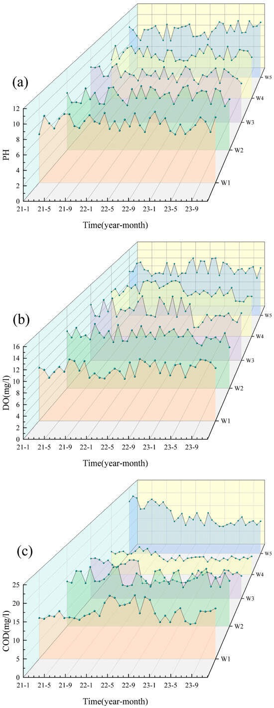 Water samples were collected monthly from January to October 2021–2023 at five sites (W1–W5) at a 0.5 m depth using sterile containers, following the Water Quality Sampling Technical Guidance (HJ 494—2009) [12]. Water samples were analyzed for a comprehensive suite of physicochemical parameters to evaluate water quality. The parameters assessed included pH, total phosphorus (TP), total nitrogen (TN), dissolved oxygen (DO), nitrate nitrogen (NO3−-N), ammonia nitrogen (NH3-N), and chemical oxygen demand (COD). Each parameter was measured in strict accordance with the respective national standard methodologies: pH was determined following GB/T 6920-1986 [13], TP via GB 11893-89 [14], TN using HJ 636-2012 [15], DO according to GB 7489-87 [16], NO3−-N by HJ/T 84-2001 [17], NH3-N as per HJ 536-2009 [18], and COD following GB/T 32208-2015 [19]. These standardized methods ensure the reliability and comparability of the data collected, facilitating a robust assessment of water quality.