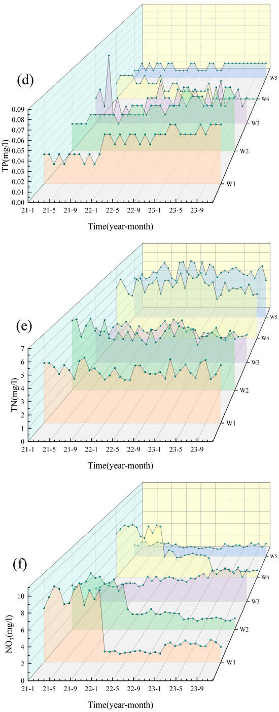 Based on the water quality data for the five cross-sections (W1–W5) of the Shi River from 2021–2023, the water quality indicators were generally stable from year to year and did not show a continuous deteriorating trend (Figure 2). Most pollutants (e.g., NH3-N, TP) peaked in 2022 and then declined in 2023, indicating an improvement in water quality. Particularly in summer (June–August), concentrations of nitrogen and phosphorus pollutants increased significantly due to high temperatures and rainfall during the flood season. TN, NO3-N and NH3-N peaked in summer, with the highest concentration of TN reaching W4 (6.44 mg/L) in July 2022, which exceeded the national Class V standard (2.0 mg/L). In contrast, water quality improved during the winter months (December–February) when pollutant concentrations generally decreased due to reduced water flow and cooler conditions. DO decreased in summer due to the decomposition of organic matter and increased microbial activity. It recovered in winter due to the increased reoxygenation capacity of the water body at low temperatures. WT showed significant seasonal fluctuations, peaking in summer (e.g., 23–27 °C at W4 and W5 in July 2022) and dropping to 0–2 °C in winter (e.g., January 2021 and 2023) across all sites.