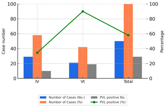 These isolates were collected between 2018 and 2020 and were selected based on sample availability and the feasibility of extended molecular testing. The selection aimed to reflect recent trends and allowed for in-depth analysis of clonal distribution. Figure 2 illustrates the PVL positivity rates among the SCCmec IV and Vt subtypes in these genotyped isolates.