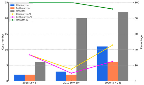As shown in Figure 3, the bar graphs represent the number of CA-MRSA isolates resistant to clindamycin, erythromycin, and co-trimoxazole in each year (2018–2020), while the line graphs indicate the corresponding susceptibility rates. Resistance to erythromycin and clindamycin remained high throughout the study period, with susceptibility rates of only 10% and 15% in 2018, increasing to 40% and 50% in 2020, respectively. In contrast, susceptibility to TMP-SMX remained consistently high, with rates of 100% in 2018, 95% in 2019, and 91.7% in 2020. Figure 3 provides a visual summary of annual changes in CA-MRSA resistance between 2018 and 2020. However, because the distribution of SCCmec subtypes varied across these years, the resistance data should be interpreted descriptively, rather than as evidence of statistically validated temporal trends.