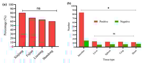 (a) Percentage of positive E. coli from four Chinese provinces. (b) Distribution of E. coli from different sample types. * Indicates a significant difference; ns indicates a non-significant difference.