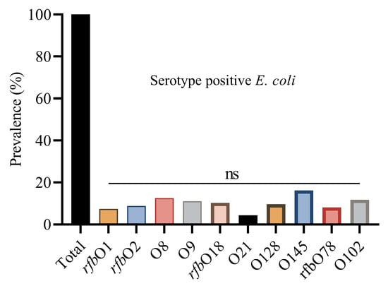Overall percentage prevalence of E. coli serotypes. ns indicates a non-significant difference.