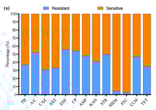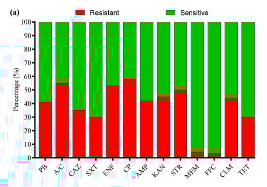 All 33 APEC strains were subjected to AST using the Kirby–Bauer disk diffusion assay. Most of the APEC strains were resistant to cefepime (58%), followed by amoxicillin/clavulanate (55%), enrofloxacin (53%), streptomycin (50%), kanamycin (45%), clindamycin (44%), ampicillin (42%), polymyxin B (41%), ceftazidime (35%), tetracycline and sulfamethoxazole/trimethoprim (30% each), meropenem (4.3%), and florfenicol (3.3%) (Figure 7a). Moreover, the MDR analysis showed a higher prevalence of MDR APEC strains from Shandong (66%) compared to Liaoning (65%), Xinjiang (62%), and Fujian (54%) (Figure 7b).