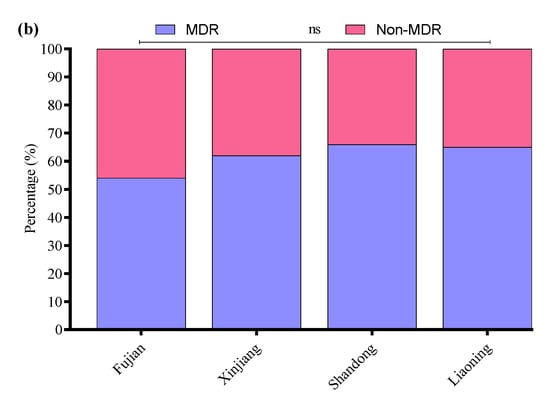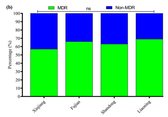 (a) Antibiotic susceptibility profile of E. coli-positive isolates. (b) Percentage prevalence of MDR E. coli isolates in different provinces of China. ns indicates a non-significant difference.