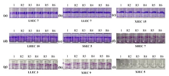Biofilm formation of E. coli isolates: (a) Liaoning spleen E. coli (LSEC 7) strong biofilm, (b) Liaoning liver E. coli (LLEC 7) strong biofilm, (c) Xinjiang intestine E. coli (XIEC 15) strong biofilm, (d) Liaoning heart E. coli (LHEC 10) mild biofilm, (e) Shandong spleen E. coli (SSEC 5) mild biofilm, (f) Shandong heart E. coli (SHEC 7) weak biofilm, (g) Liaoning liver E. coli (LLEC 3) weak biofilm, (h) Xinjiang intestine E. coli (XIEC 9) weak biofilm, and (i) Xinjiang intestine E. coli (XIEC 5) Negative/No biofilm formation.