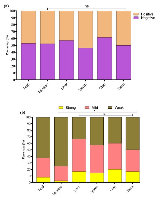 (a) Overall, biofilm-forming (positive) and non-biofilm-forming (negative) E. coli strains were isolated from different tissues. (b) Percentage of weak, mild, and strong biofilm-producing E. coli among biofilm-positive E. coli in various tissue samples. * Indicates a significant difference; ns indicates a non-significant difference.