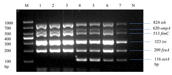 - Meng, Q.; Meng, Q.; Wang, S.; Han, X.; Han, Y.; Ding, C.; Dai, J.; Yu, S. Multiplex PCR assay for detection of virulence genes in avian pathogenic Escherichia coli. Wei Sheng Wu Xue Bao 2014, 54, 696–702. [Google Scholar]