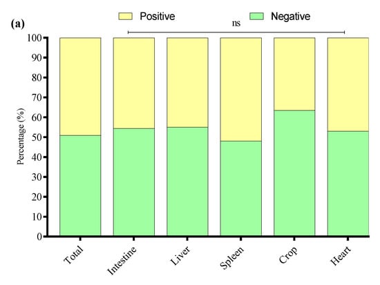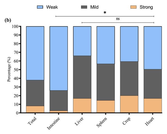 (a) Overall biofilm forming (positive) and non-biofilm forming (negative) by APEC strains isolated from different tissues. (b) Percentage of weak, mild, and strong biofilm-producing among biofilm-positive APEC strains in various tissue samples. * Indicates a significant difference; ns indicates a non-significant difference.
