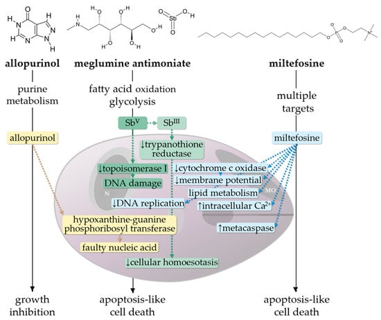 Effect of allopurinol, meglumine antimoniate and miltefosine on intracellular Leishmania amastigotes [22,23,24]. The hypoxanthine analogue allopurinol interferes with the parasitic purine salvage pathway; as a substrate of the enzyme hypoxanthine-guanine phosphoribosyl transferase, it is phosphorylated and integrated in nucleic acid, leading to growth inhibition [22,25]. Pentavalent antimony (SbV), which is the active ingredient in meglumine antimoniate, is assumed to inhibit glycolysis, fatty acid oxidation, and enzymatic activity of DNA topoisomerase I, but exact antileishmanial mechanisms remain partially unclear. Reduction of SbV to the more toxic trivalent form (SbIII), which has high affinity for thiol-containing proteins, causes inhibition of the enzymatic activity of trypanothione reductase. Redox state and transcription regulation are disturbed, resulting in oxidative stress and cell death [26,27]. Miltefosine reduces the mitochondrial membrane potential and inhibits cytochrome c oxidase activity, which leads to an increased production of reactive oxygen species. Additionally, an effect on membranous Ca2+ channels and parasitic organelles (acidosomes) causes disturbance in Ca2+ homeostasis. Miltefosine further leads to an enhancement of metacaspases and inhibition of the parasites’ DNA synthesis and might influence lipid metabolism, for which exact mechanisms remain partially unclear [28,29,30]. MO, mitochondrion; N, nucleus.