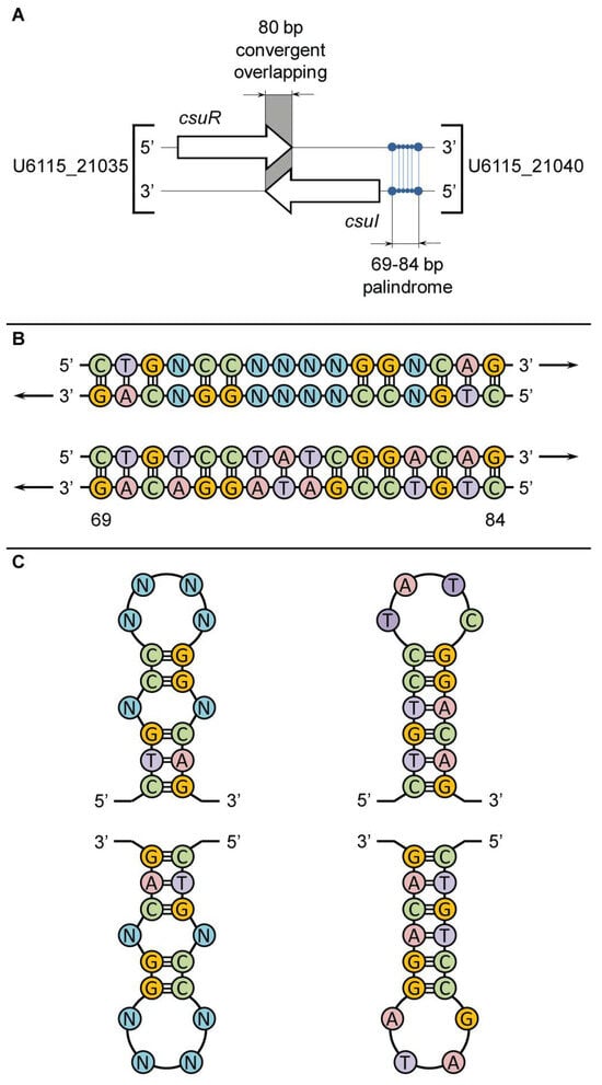 In the first round of genomic analysis, we clarified the nucleotide sequence of the 16-base-pair palindrome in the promoter region of CsuI AHL-synthase (ORF U6115_21040). As in C. violaceum ATCC 12472, in C. subtsugae ATCC 31532, this gene is located on the reverse DNA strand and is transcribed in the opposite direction to the CsuR receptor gene (ORF U6115_21035), and the terminal regions of the csuR and csuI genes have an 80 bp overlap zone (Figure 3A). In the promoter zone of the csuI gene (positions -69 and -84 to the transcription start site), a palindrome 5′-CTGTCCGATAGGACAG-3′ was found, exactly corresponding to the previously described ideal sequence. Due to the location on the reverse strand, the GAC triplet is proximal to the csuI gene and the GTC triplet is distal (Figure 3B). Interestingly, the nucleotide sequences of the two paired antiparallel DNA strands indicate the possibility of developing symmetrical stem-loop-like secondary structural elements via intramolecular base pairing in the left and right single-stranded halves of the 16-base-pair palindrome (Figure 3C). This is proposed to provide a double recognition site for the dimeric CsuR protein and generates a canonical QS positive feedback regulatory loop. In turn, the overlapping topology of the convergent csuR and csuI genes may result in negative regulation of their co-expression [48], which protects the autoinduction system from “overheating”.
