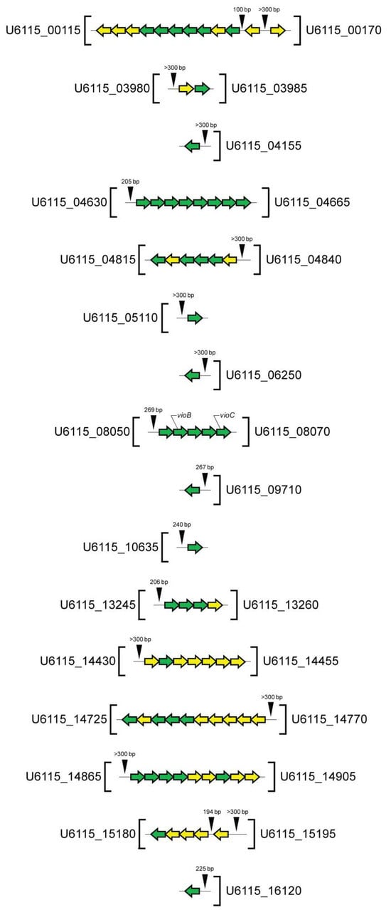 Accordingly, in a second round of genomic analysis, we scanned the C. subtsugae ATCC 31532 genome for potential CsuR binding sites that up-regulate the transcription of the genes and gene clusters described above. For this purpose, the position of the genes of interest, the direction of their transcription, and the location and size of the putative promoter regions were determined.