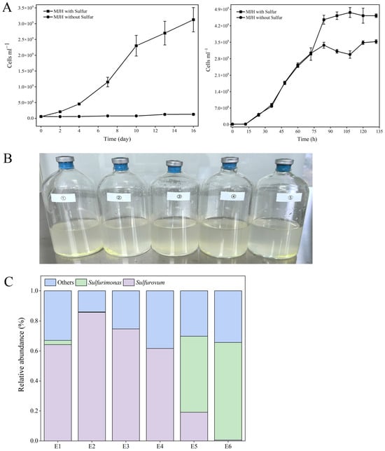 Medium optimization and enrichment of autotrophic Campylobacterota. (A) Cell counts of Sulfurovum fonticola CS14 (left) and Sulfurimonas fonticola CS47 (right) cultured in MJH medium with or without sulfur. Values are the means of triplicate experiments and shown as means ± SD. (B) Representatives of the enrichments. (C) Distribution of Sulfurovum and Sulfurimonas in different enrichments (E1 to E6).