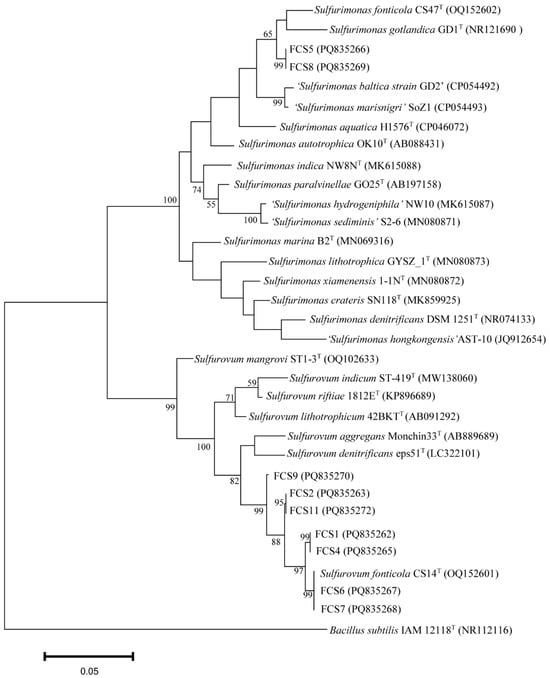 Since, as shown above, Sulfurovum and Sulfurimonas had the highest diversities in the cold seep, we aimed to isolate these strains from the various samples. To date, Sulfurovum fonticola CS14 and Sulfurimonas fonticola CS47 are the only strains isolated from cold seep [15]. CS14 was able to grow in the MJH medium (MJ medium with hydrogen) but with a long lag phase (could be more than 17 days) (Figure 2A; Table S3). The presence of sulfur markedly promoted the growth of Sulfurovum but had no effect on the growth of Sulfurimonas (Figure 2A; Table S3). This optimized medium (i.e., MJH with S0) was then used to enrich the Formosa cold seep samples. Eleven enrichments were obtained (Figure 2B). Subsequent 16S rRNA sequence analysis showed that Sulfurovum and Sulfurimonas were indeed enriched (Figure 2C). In total, nine strains were isolated and named FCS (Formosa Cold Seep) 1, 2, 4, 5, 6, 7, 8, 9, and 11 (Table S4). Based on 16S rDNA and phylogenetic analyses, seven strains were classified under the genus Sulfurovum (Figure 3 and Table S4). Strains FCS2 and 11 were 100% identical and most closely related to S. fonticola CS14 (98.4% identity). Strain FCS9 was also most closely related to S. fonticola CS14 (97.8% identity) (Figure 3 and Table S4). According to the 98.7% identity threshold of species [34], strains FCS2, 9, and 11 were novel species of the genus Sulfurovum. Strains FCS6 and FCS7 were 100% identical to S. fonticola CS14, and strains FCS1 and FCS4 were most closely related (99.1% identity) to S. fonticola CS14, implying that these strains may belong to S. fonticola (Figure 3 and Table S4). FCS5 and FCS8 were classified as Sulfurimonas and were most closely related (96.7% identity) to Sulfurimonas fonticola CS47 (Figure 3 and Table S4). Hence, these two strains are novel species of the genus Sulfurimonas.