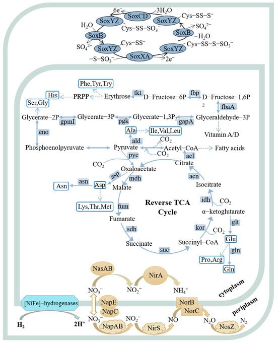 Metabolic pathways of strains FCS5 and FCS9 were reconstructed based on the KEGG database. In the pathway diagrams, metabolic routes are depicted by solid arrows, and dashed lines signify multi-step processes. Strains FCS5 and FCS9 are similar in the examined metabolic pathways, except that FCS5 possesses a complete sulfur-oxidizing system (soxABXYZ and soxCDYZ), while FCS9 possesses only soxCDYZ.