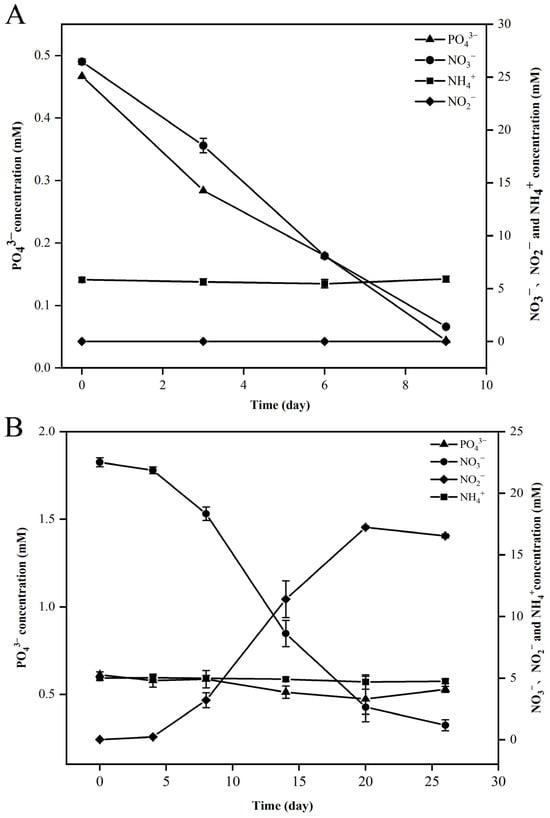 Changes in nitrate (NO3−), nitrite (NO2−), ammonia (NH4+), and phosphate (PO43−) during the growth of strains FCS5 (A) and FCS9 (B). Values are the means of triplicate experiments and shown as means ± SD.