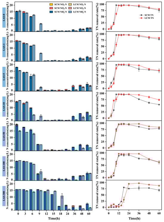 Nitrogen removal by SCM and LCM at different LAS concentrations, including NO2−-N, NO3−-N, and NH4+-N concentrations, as well as TN removal efficiency.
