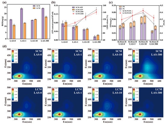 Indicators of SCM and LCM at different LAS concentrations. (a) ROS concentration; (b) ATP content and LDH release rate; (c) EPS content and composition; (d) three-dimensional fluorescence spectra.