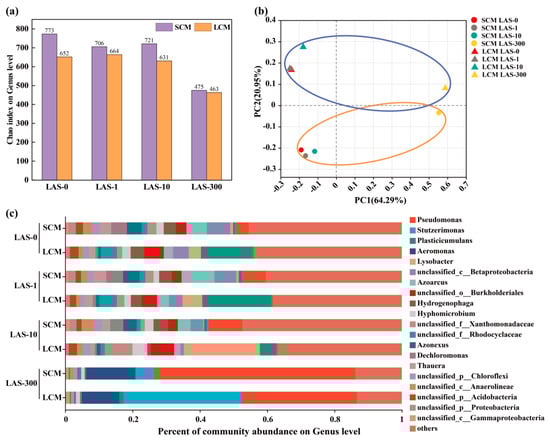 Microbial community composition of SCM and LCM at different LAS concentrations. (a) Chao index; (b) PCoA (Blue circles: LCM samples; Red circles: SCM samples); (c) microbial community composition (top 20 genera).