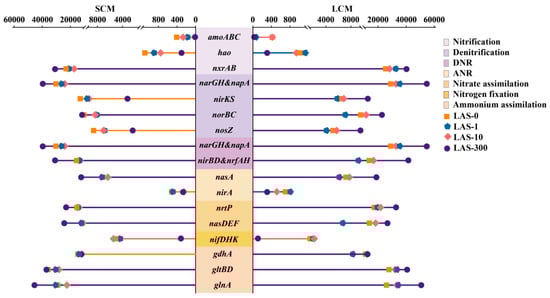 Abundance of nitrogen functional genes in SCM and LCM at different LAS concentrations.