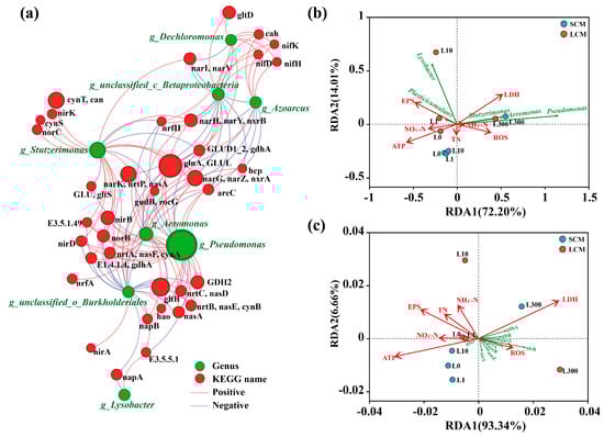 (a) Network correlation analysis of nitrogen-metabolizing species and functional genes (Pearson’s correlation coefficient > 0.5, p < 0.05). Redundancy analyses based on the relationship between (b) key genera; (c) nitrogen functional genes and environmental variables in biological samples. L0, L1, L10, and L300 denote LAS-0, LAS-1, LAS-10, and LAS-300, respectively.