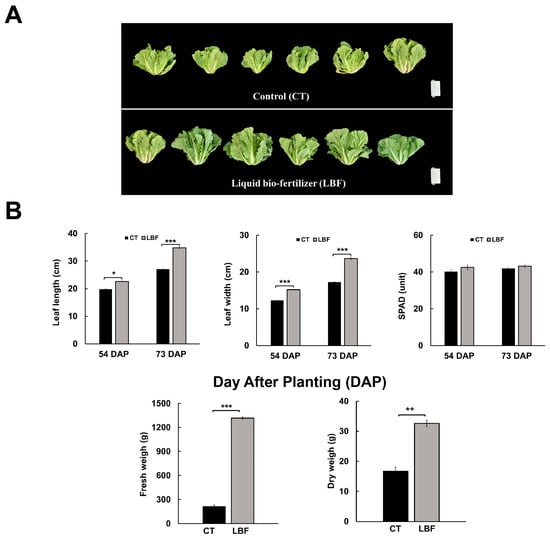 To evaluate the growth-promoting effects of LBF, phenotypic changes in Chinese cabbage were observed on 54 and 73 DAP (Figure 1). On 73 DAP, the LBF group exhibited significant morphological improvements in leaf development and overall plant size compared to the control (CT) group, suggesting enhanced growth owing to the LBF application (Figure 1A). The leaf length, leaf width, SPAD unit, and weight of the aerial part were measured on 54 and 73 DAP (Figure 1B). On 54 DAP, the leaf length in the LBF group was 22.67 cm, which was 2.86 cm longer than that in the CT group (19.81 cm). Similarly, the leaf width in the LBF group was 15.19 cm, which was 2.92 cm wider than that in the CT group (12.27 cm). On 73 DAP, the leaf length was 34.80 cm in the LBF group and 27.08 cm in the CT group, and the leaf width was 23.68 cm in the LBF group and 17.25 cm in the CT group. The length and width of leaves increased by 1.3-fold compared to the CT group, indicating a significant enhancement in vegetative growth. The fresh weight of the LBF group was 1316.67 g, which was 6.27 times higher than that of the CT group (210 g). Similarly, the dry weight of the LBF group (49.33 g) was 2.96 times higher than that of the CT group (16.67 g). Although the SPAD index, which is an indicator of chlorophyll content, was relatively high in the LBF-treated group, the difference between the two treatment groups was not significant (p > 0.05). The SPAD units in the LBF group were 42.51 and 43.26 on 54 and 73 DAP, respectively, whereas the CT group showed SPAD values of 40.15 and 41.86 on 54 and 73 DAP, respectively. Overall, these results demonstrate that an LBF application significantly promotes plant growth.