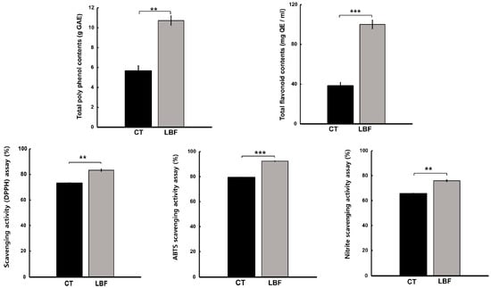 To investigate the effects of LBF on plant quality, the antioxidant activities, including TPC, TFC, DPPH radical, ABTS, and nitrite scavenging activities, were evaluated in the entire aerial part of Chinese cabbage after harvesting (Figure 2). The TPC values were 10.72 and 5.64 g GAE, and the TFC values were 100.06 and 38.27 g QE in the LBF and CT groups, respectively. DPPH scavenging activities were 83.32% and 73.09%, ABTS scavenging activities were 92.38% and 79.31%, and nitrite scavenging activities were 75.97% and 65.54% in the LBF and CT groups, respectively. The antioxidant activities increased in the entire aerial part of the Chinese cabbage. However, the levels of antioxidants in the same amount of plant tissues significantly decreased (Figure S2). These results suggest that LBF has a greater effect on promoting plant growth than on the accumulation of antioxidant compounds in plant cells.