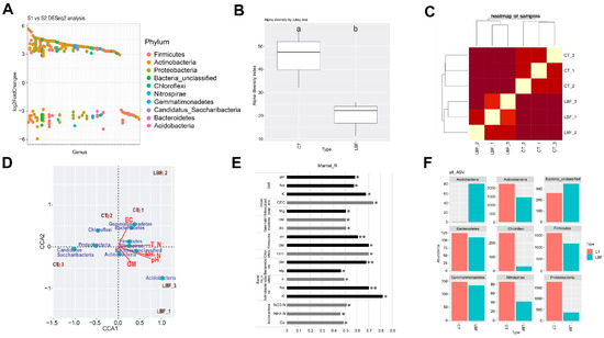 ASVs were analyzed to evaluate the impact of LBF on the soil microbiota (Figure 3). A total of 240 ASVs (p < 0.05) were identified between the CT and LBF samples (Figure 3A). These ASVs were classified into ten bacterial phyla: Firmicutes, Actinobacteria, Proteobacteria, unclassified Bacteria, Chloroflexi, Nitrospirae, Gemmatimonadetes, Candidatus_Saccharibacteria, Bacteroidetes, and Acidobacteria. Additionally, the assessment of soil microbial diversity (Alpha Diversity) revealed that the CT soil sample exhibited higher bacterial diversity than did the LBF sample, indicating the potential influence of LBF treatment on soil microbial abundance (Figure 3B). Hierarchical clustering was performed to evaluate the similarities between microbial communities in the soil samples (Figure 3C). The CT and LBF groups clustered separately on the heatmap, indicating a clear difference in microbial composition between the two experimental groups. The LBF group was positioned in the upper and lower right quadrants of the canonical correspondence analysis (CCA) plot (Figure 3D). Specifically, two samples (LBF_1 and LBF_3) of the LBF group showed a strong correlation with NH4+-N, pH, and OM among the chemical properties and with Acidobacteria among the bacterial phyla. This suggests that LBF application may affect several nutrient-related chemical properties by increasing the abundance of Acidobacteria. To demonstrate the significant correlations between the microbial communities and soil properties, a Mantel test was conducted between the bacterial phyla of the 240 ASVs and chemical properties (Figure 3E). DAB (differentially abundant bacteria) exhibited robust correlations with K (p < 0.05), Na (p < 0.05), and pH (p < 0.01), indicating that the soil chemical compositions significantly influenced the distinct microbial community structures across treatments. Proteobacteria demonstrated a strong positive correlation with CEC (p < 0.05), which may reflect their adaptability to soils with higher nutrient retention capacity. Chloroflexi showed a significant correlation with CEC (p < 0.05), while Gemmatimonadetes exhibited moderate associations with both OM (p < 0.05) and EC (p < 0.05). Firmicutes showed significant positive correlations with OM (p < 0.05) and pH (p < 0.05), suggesting their sensitivity to soil carbon and acidity levels. Bacteroidetes were positively correlated with OM (p < 0.01) and Mg (p < 0.05), suggesting their role in organic matter decomposition and mineral cycling. Actinobacteria were strongly associated with K (p < 0.05) and Na (p < 0.01), implying their potential salt tolerance and nutrient responsiveness. Nitrospirae were significantly associated with Mg (p < 0.05), while Acidobacteria exhibited correlations with multiple nitrogen-related parameters, including NH4+-N (p < 0.05), NO3−-N (p < 0.05), and Ca (p < 0.05), suggesting their involvement in nitrogen cycling and calcium dynamics. The relative abundance of the major bacterial phyla significantly varied between the CT and LBF-treated soils (Figure 3F). The application of LBF led to a substantial increase in Acidobacteria and unclassified bacteria, whereas the abundance of Chloroflexi, Firmicutes, and Proteobacteria decreased. However, the abundance of Bacteroidetes did not show any significant differences among the experimental groups. These results suggest that the application of LBF influences nutrient availability and microbial interactions.