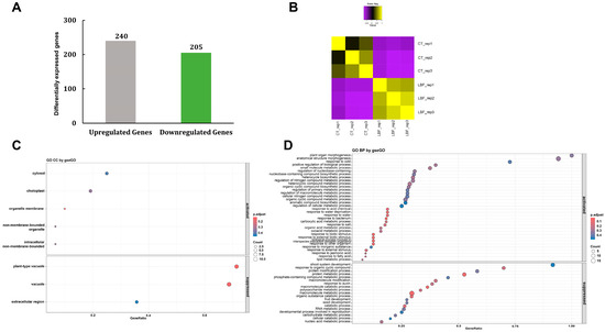 RNA-seq analysis was employed to assess the transcriptomic alterations in cabbage subjected to LBF application (Figure 4). A total of 445 genes exhibited significant differential expression genes (DEGs) (p < 0.05), comprising 240 upregulated and 205 downregulated genes (Figure 4A). To assess the overall similarity and clustering among samples, a sample correlation matrix was constructed based on global gene expression profiles and visualized as a heatmap (Figure 4B). The heatmap revealed a clear separation between CT and LBF, with high within-group correlation and consistent expression patterns among replicates, whereas substantial differences were observed between the two experimental groups.