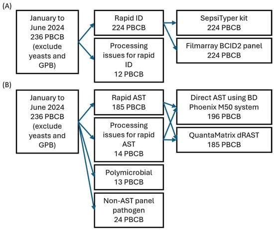Study flowchart of rapid identification (A) and antimicrobial susceptibility tests (B). Due to processing issues and test availability, 196 PBCBs were tested with the BD Phoenix M50 system and 185 with QuantaMatrix dRAST. Abbreviations: PBCB, positive blood culture broth; GPB, Gram-positive bacilli; ID, identification; AST, antimicrobial susceptibility test.
