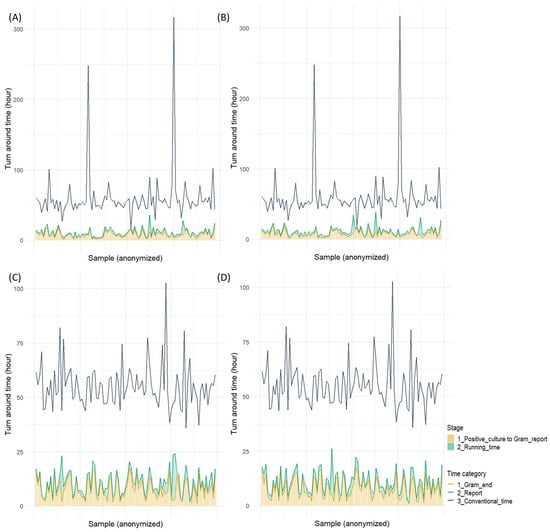 Turnaround time for two rapid identification tests: (A) SepsiTyper kit for Gram-positive cocci, (B) Filmarray BCID2 panel for Gram-positive cocci, (C) SepsiTyper kit for Gram-negative bacilli, (D) Filmarray BCID2 panel for Gram-negative bacilli.