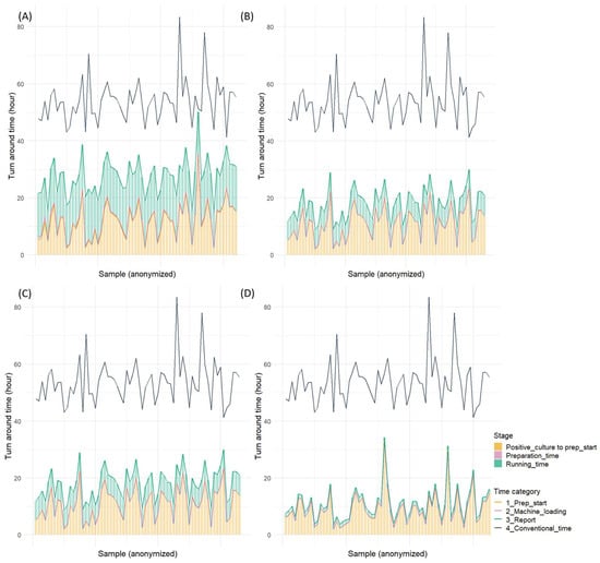Turnaround time for four rapid antimicrobial susceptibility tests (Gram-negative bacilli): (A) direct AST using BD Phoenix M50 system, (B) QuantaMatrix dRAST 1.5.1 version, (C) QuantaMatrix dRAST 1.6.1 version, and (D) Filmarray BCID2 panel.