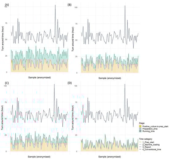 Turnaround time for four rapid antimicrobial susceptibility tests (Gram-positive cocci): (A) direct AST using BD Phoenix M50 system, (B) QuantaMatrix dRAST 1.5.1 version, (C) QuantaMatrix dRAST 1.6.1 version, and (D) Filmarray BCID2 panel.