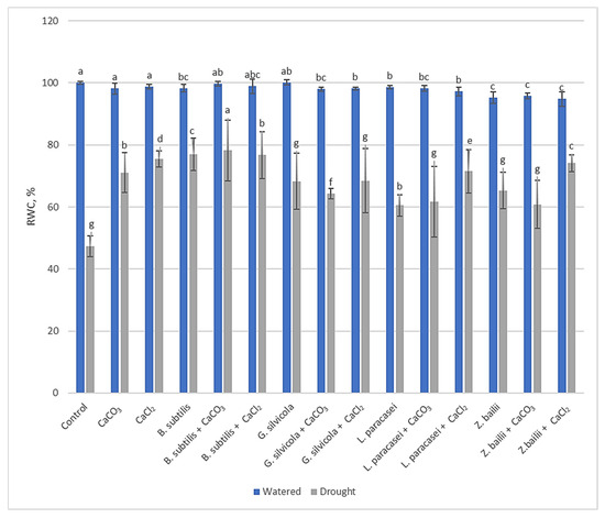 Impact of PGPMs and Ca salts on RWC of winter wheat leaves after drought stress. Error bars represent the standard deviation of the mean. Means with different letters in the same color columns are significantly different (p < 0.05).