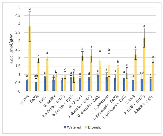 The effect of PGPMs and Ca salts application and prolonged drought stress on winter wheat H2O2 content. Error bars represent the standard deviation of the mean. Different lowercase letters in the same color columns indicate statistically significant differences (p < 0.05).