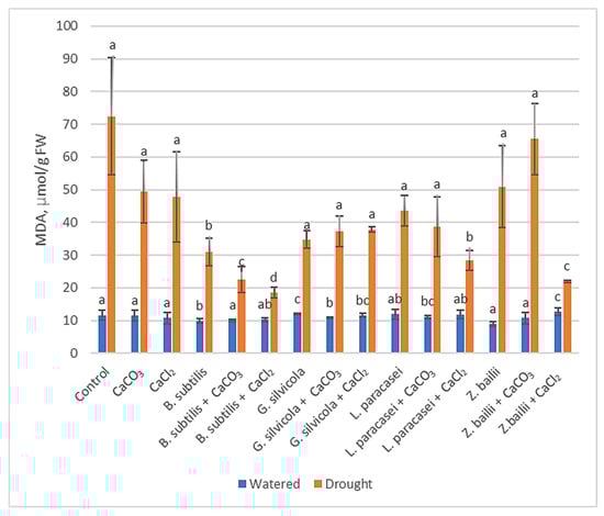 The effect of PGPMs and Ca salts application and prolonged drought stress on winter wheat MDA content. Error bars represent the standard deviation of the mean. Different lowercase letters in the same color columns indicate statistically significant differences (p < 0.05).