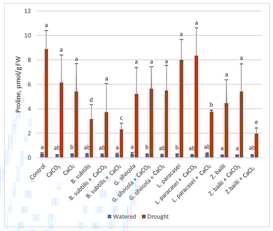 The effect of PGPMs and Ca salts application and prolonged drought stress on winter wheat proline accumulation. Error bars represent the standard deviation of the mean. Different lowercase letters in the same color columns indicate statistically significant differences (p < 0.05).