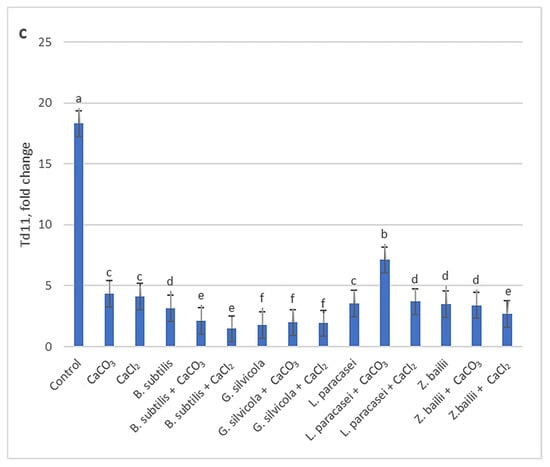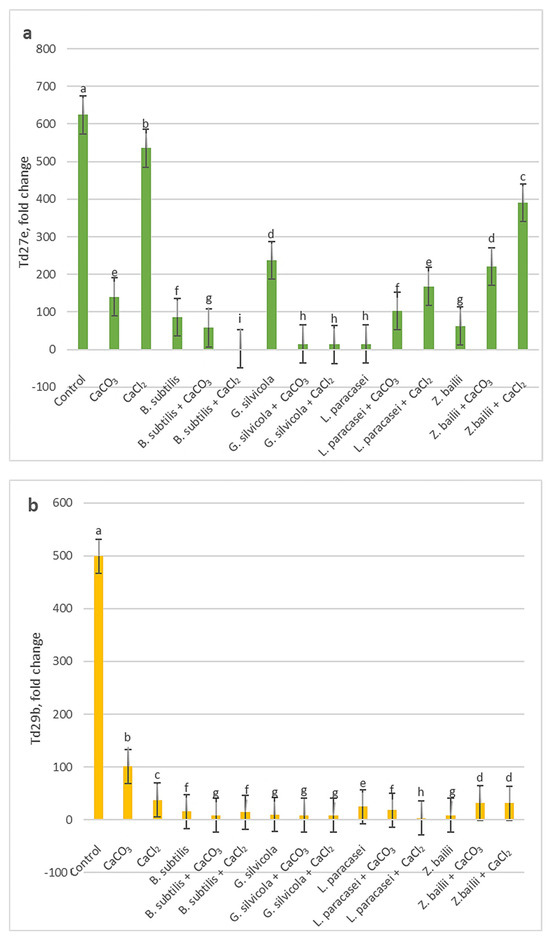 The quantitative results of the RT-qPCR analysis showed that among the three studied genes, the Td27e gene was more highly expressed in drought stress. The level of Td27e expression in the Control sample was significantly higher than in all treated types (Figure 5a). Td29b gene expression levels were markedly lower in all treated variants compared with the Control (Figure 5b). The lowest levels of expression of the Td11 gene were recorded in the samples of plants treated with the combinations of Bacillus subtilis and Ca salts and Geotrichum silvicola and Ca salts (Figure 5c).