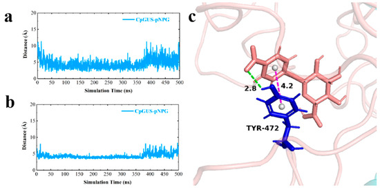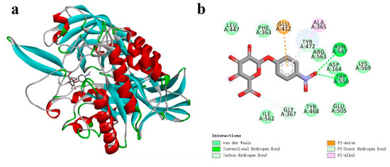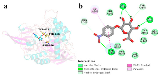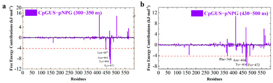 | CpGUS–pNPG | 300–350 | Leu447 | −6.83 | 2.90 | −0.66 | −4.60 |