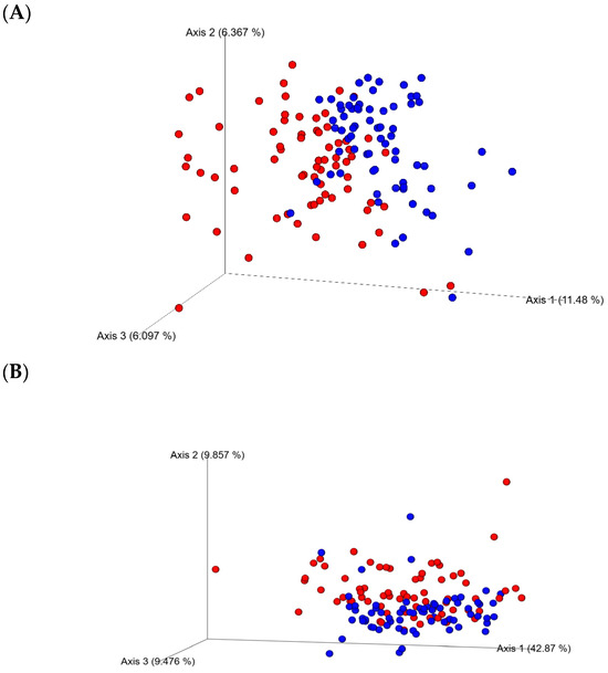 Beta-diversity of bacterial communities in the ceca from the broiler chicken fed bacitracin, berry pomace (studied) diets alone or in combination with a multienzyme mixture. The principal coordinate analysis (PCoA) plots of unweighted (A) and weighted (B) Unifrac distance matrices, colored by day: (Red) 21-day-old and (Blue) 35-day-old. Significant clustering of samples from both days (PERMANOVA, p < 0.05) is shown.