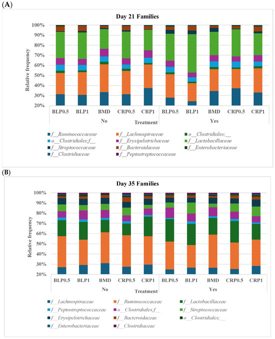 Taxonomic profile of bacterial communities at the family level in the cecal samples of 21- (A) and 35- (B) day-old broiler chickens fed bacitracin (BMD), or cranberry (CRP at 0.5 and 1%) and blueberry (LBP at 0.5 and 1%) pomaces alone (No) or in combination (Yes) with a multienzyme supplement. (n = seven pens/treatment, 2 birds/pen: 14 birds/treatment).