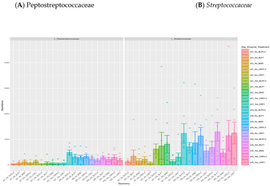 Relative abundances of cecal Peptostreptococcaceae (A) and Streptococcaceae (B) families: (A) significant differences between 21- and 35-day-old broiler chickens fed bacitracin (BMD), or cranberry (CRP at 0.5 and 1%) and blueberry (LBP at 0.5 and 1%) pomaces alone (No) or in combination (Yes) with a multienzyme mixture. (p < 0.05).