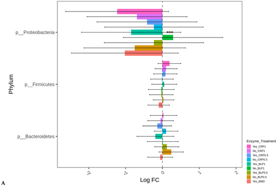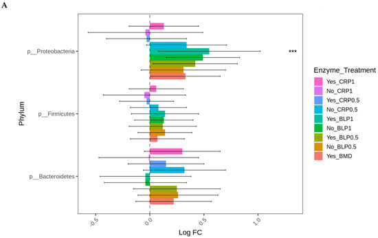 Cecal bacterial phylum (A) and order (B) of day 35 of age broiler chickens significantly affected by the dietary bacitracin (BMD) or cranberry (CRP at 0.5 and 1%) and blueberry (LBP at 0.5 and 1%) pomaces alone (No) or in combination (Yes) with a multienzyme mixture. The horizontal axis represents log-fold changes in absolute abundance associated with the diet with or without enzyme (enzyme = treatment) relative to the BMD alone (reference) as determined by the differential abundance analysis performed using ANCOM-BC2. Taxa with statistically significant changes in their abundance relative to the reference group are shown (*** p < 0.001); the bars represent standard errors.