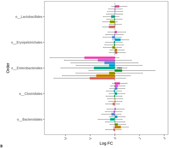 At D35, except for the birds fed LBP1 alone, the abundance of Proteobacteria decreased in all the other groups (p < 0.001). No significant differences in the differential abundance of Firmicutes and Bacteroidetes were observed for any treatment group compared to BMD alone as the control. The order Enterobacteriales presented similar differential abundance change profiles (p < 0.001) as those of the Proteobacteria indicating that the major change in this phylum was the order Enterobacteriales (Figure 5A,B). No significant differences in the absolute abundances of other taxa levels were observed for any treatment groups compared to BMD alone as the control.