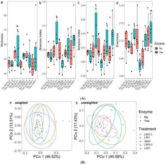(A) Alpha-diversity metrics of ARGs in 35-day-old broiler ceca broiler chickens fed bacitracin (BMD), or cranberry (CRP at 0.5 and 1%) and blueberry (LBP at 0.5 and 1%) pomaces alone or in combination with a multienzyme mixture (ENZ): (a) richness, (b) Shannon index, (c) Simpson index, and (d) Evenness. * indicates statistical difference (p < 0.05). (B) Beta-diversity of total resistance genes (resistome) in 35-day-old broiler chicken fed bacitracin (BMD), or cranberry (CRP at 0.5 and 1%) and blueberry (LBP at 0.5 and 1%) pomaces alone or in combination with a multienzyme mixture (ENZ). The results revealed by the PCoA plots of weighted (a) and unweighted (b) Bray–Curtis showed clustering based on the studied diets. Significant dissimilarity was not detected between BMD-treated and other groups (weighted only p < 0.05). No significant resistome dissimilarity was detected between the non-ENZ and ENZ groups.