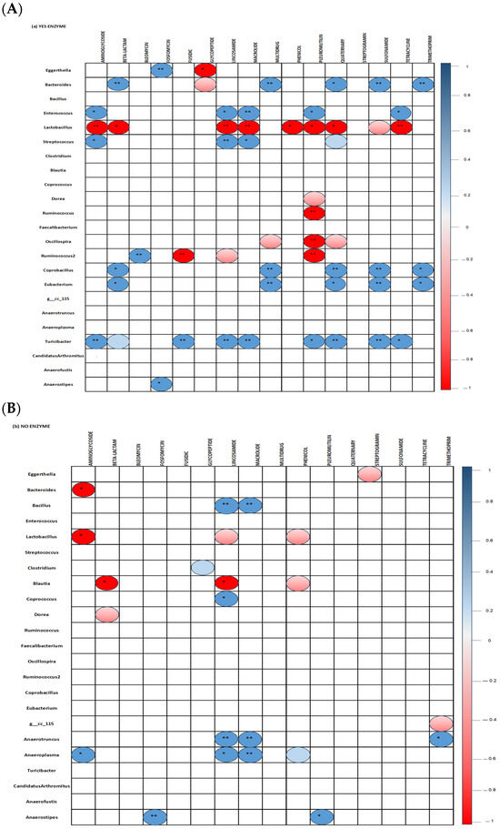 Spearman non-parametric correlations between bacterial genera and antimicrobial resistance genes in the ceca of 35-day-old broiler chickens fed studied diets with (A) or without (B) a multienzyme mixture. All statically significant correlations are indicated (* p< 0.05 and ** p < 0.001).