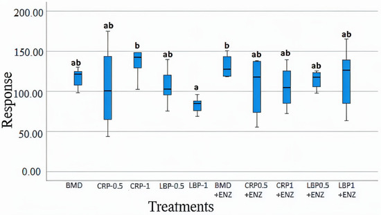 The viable counts of coliforms revealed interactions between the ENZ and LBP treatment of D21 coliform numbers (p = 0.054), while significant differences were noted between treatments (diets) (p = 0.003) on D35 coliform counts, with counts being lower in the CRP0.5-fed birds (Table 1). At the same D35, the use of ENZ in feed decreased the coliform numbers (p = 0.005).