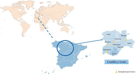 The sampling area was in the autonomous community of Castilla y León, Iberian Peninsula, Spain, with an area of 94,224 km2, which is the largest region in Spain and one of the largest in Europe. It is made up of 9 provinces (León, Zamora, Salamanca, Valladolid, Palencia, Burgos, Soria, Segovia, and Ávila). Castilla y León’s climate is classified as Mediterranean according to Köppen, meaning that it experiences short, warm summers (average temperatures of 19 to 22 °C) and lengthy, cold winters (average temperatures in January of 3 to 6 °C). Rainfall during the summer is minimal, with an average annual precipitation of approximately 450–500 mm, which is more pronounced in mountainous areas. Furthermore, various sub-climates can be identified due to the territory’s considerable extension and orographic diversity. A large part falls within the temperate with a dry summer (Csb) or temperate with a dry season and temperate summer (Cfb) sub-climates, characterised by the average of the warmest month being below 22 °C but above 10 °C for ≥5 months. In several areas of the central plateau, the sub-climate is classified as temperate with dry or hot summer (Csa), as it exceeds 22 °C during the summer, or cold steppe (BSk), with average annual temperatures below 18 °C. At higher altitudes in mountainous regions, the climate transitions to cold temperate, marked by average temperatures below 3 °C during the coldest months and dry summers (Dsb or Dsc) [].
